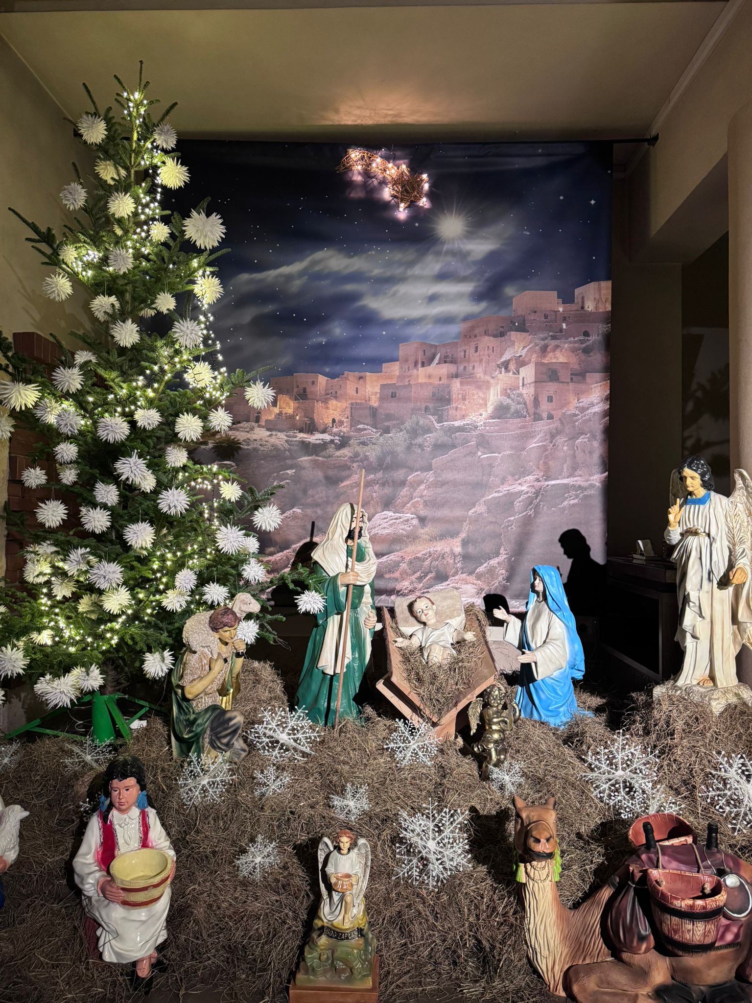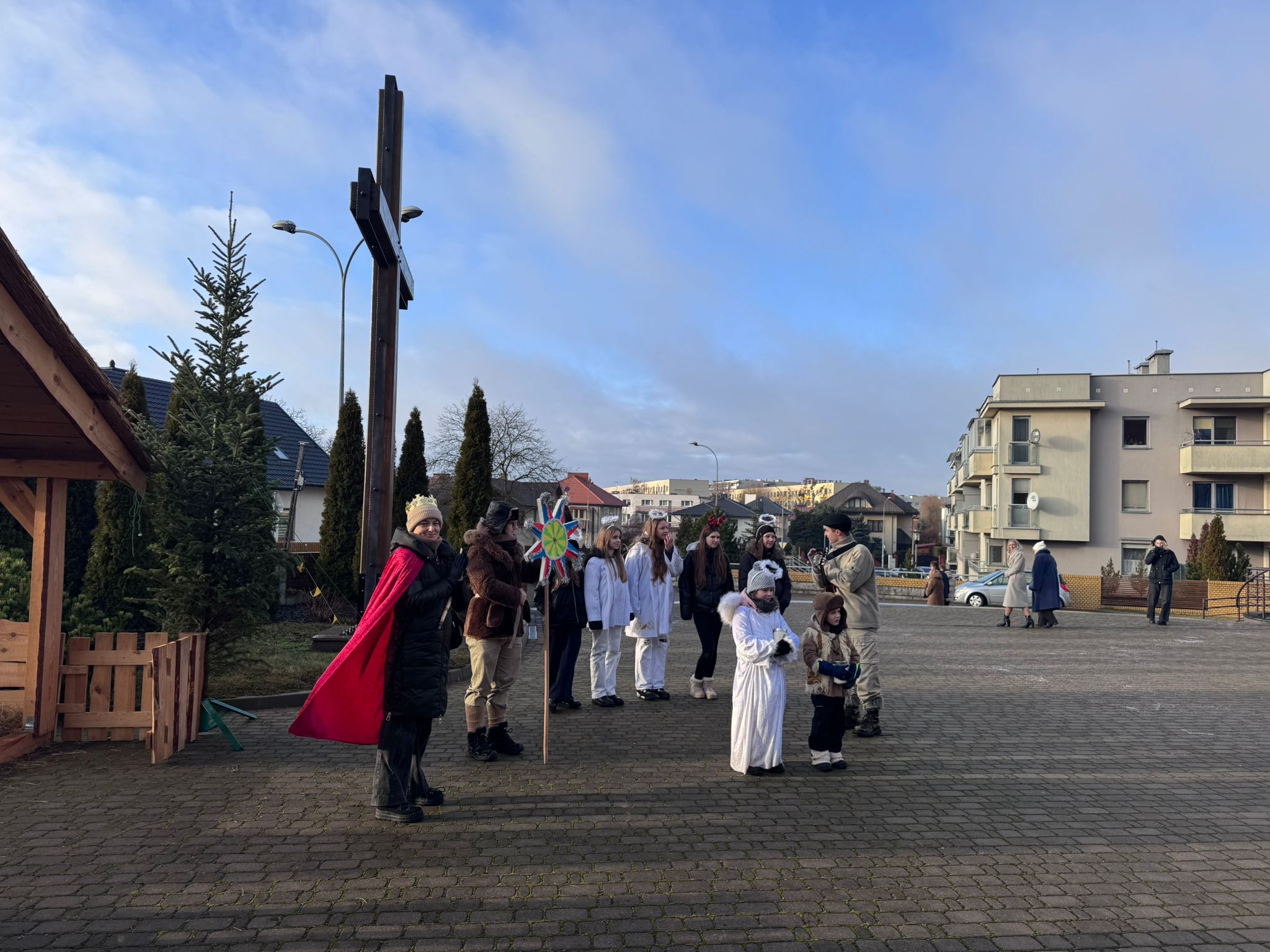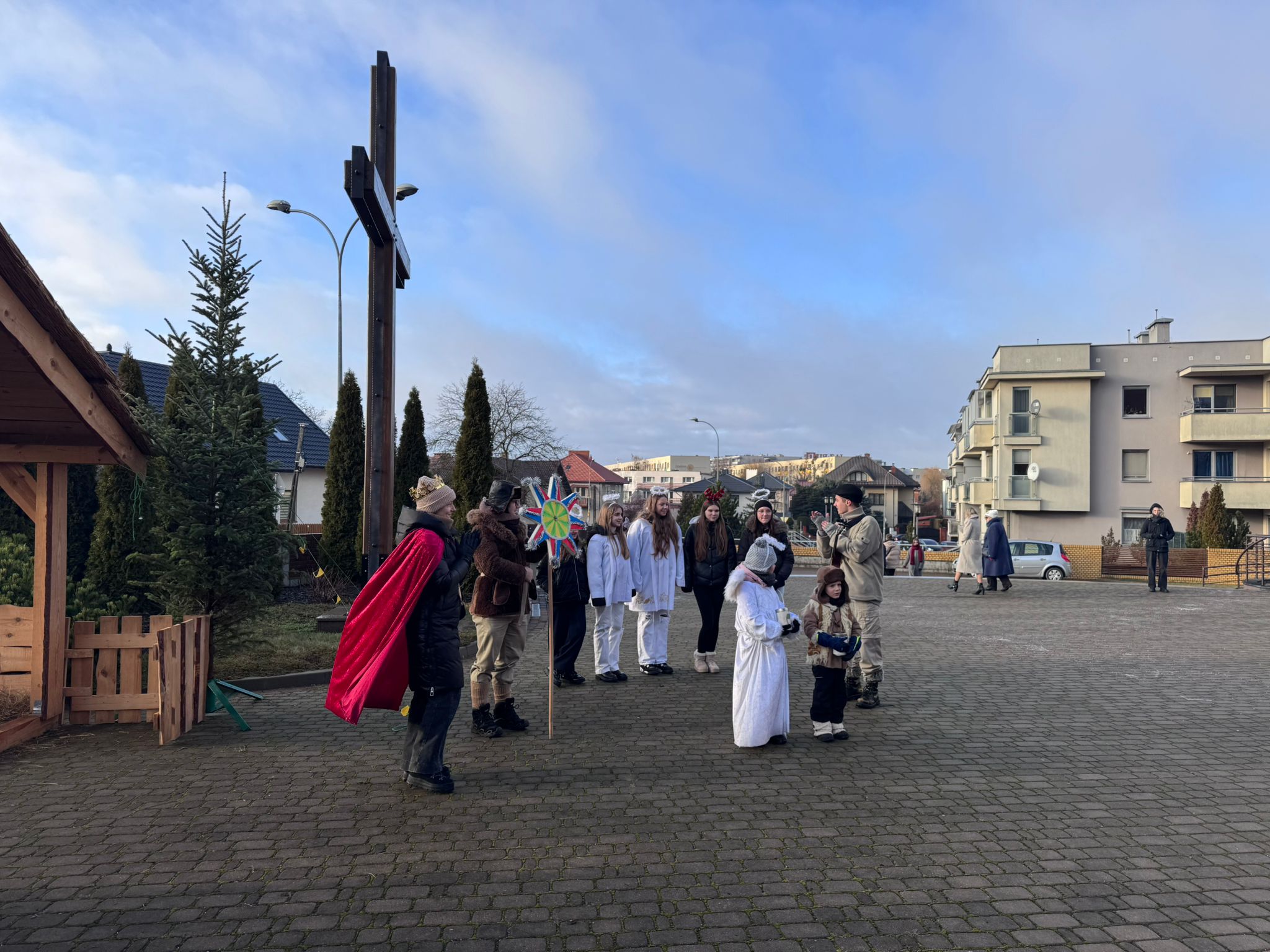 25.12.26 Kolędnicy przed kościołem i żłóbek w kościele i na placu przy krzyżu